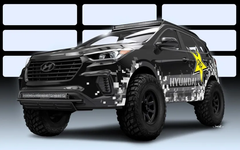 На тюнинг-шоу под названием SEMA, которое состоится в ноябре 2016 года, компания Hyundai представит рестайлинговый кроссовер Santa Fe Rockstar. В его создании приняло участие ателье Rockstar Performance Garage, должность главного инженера которого занимает Ник Эшби. Именно он и рассказал журналистам о представленной версии автомобиля. Новинка представляет собой концептуальную модель с максимально улучшенными качествами проходимости и управляемости. Hyundai Santa Fe Rockstar оснастили модернизированным 3,3-литровым силовым агрегатом. К сожалению, мощность силового агрегата пока держится в секрете, но есть информация о том, что доработки включали установку системы впрыска закиси азота и замену системы охлаждения. Из прочих изменений, которые произошли с моделью в ходе рестайлинга, можно отметить усовершенствованную подвеску с настройками для внедорожника, АКБ Odyssey, 35-дюймовые покрышки для внедорожника Mickey Thompson Baja Claw, специальные рейлинги, защиту бамперов и порогов, дополнительную светодиодную подсветку на крыше и бампере. Также тюнеры переработали тормозную систему, в результате чего спереди теперь установлены 6-поршневые механизмы, а сзади – 4-поршневые.